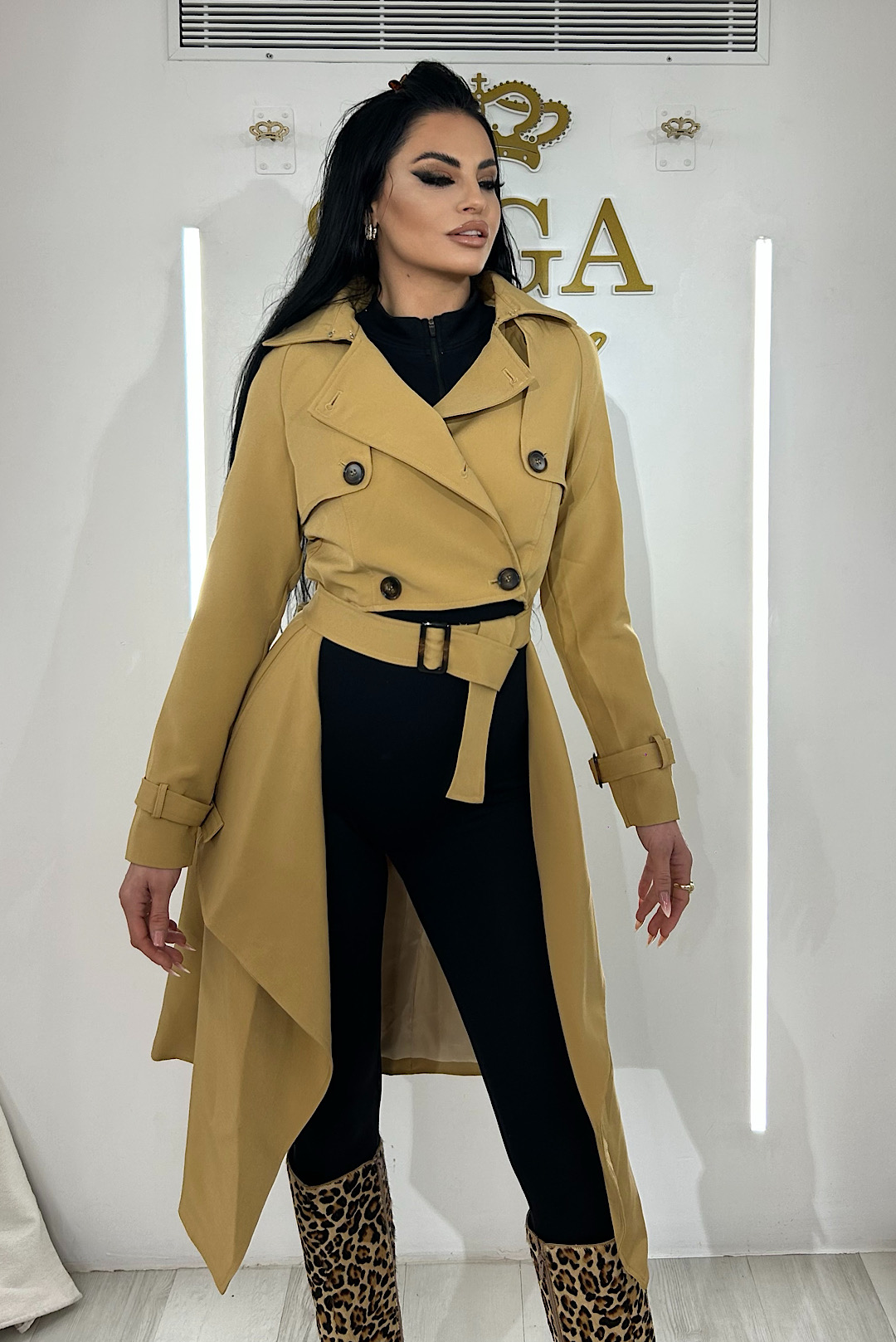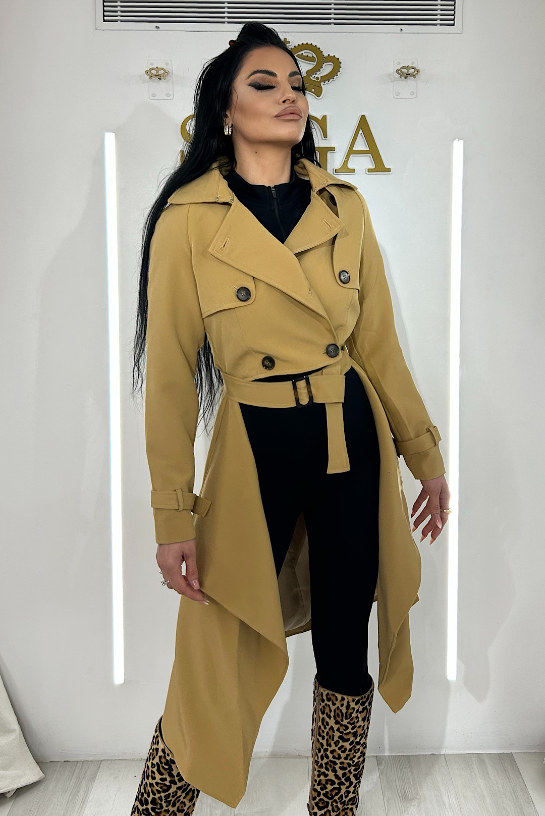 Μια εντυπωσιακή cropped καπαρτίνα σε μπέζ χρώμα και καφέ κοκκάλινα κουμπιά και αγκράφα στην ζώνη.