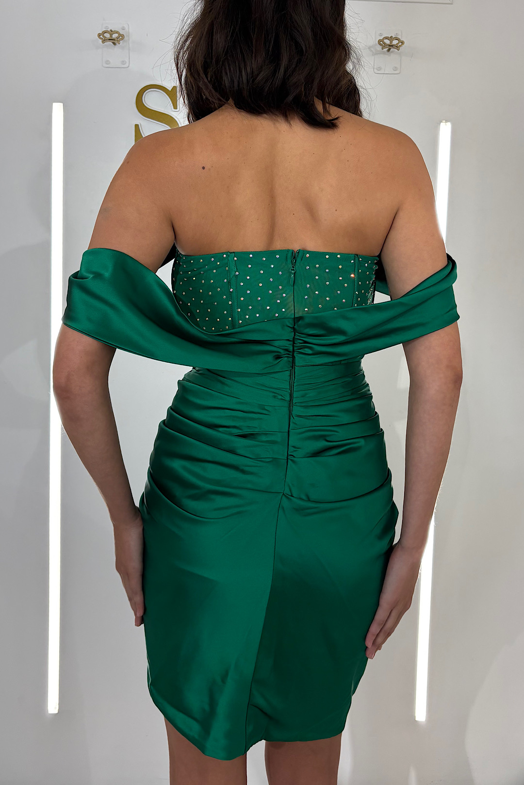 Ένα πολυμορφικό φόρεμα με επιβλητικό τελείωμα στο στήθος και γεμάτο ιριδίζον τρούκς.