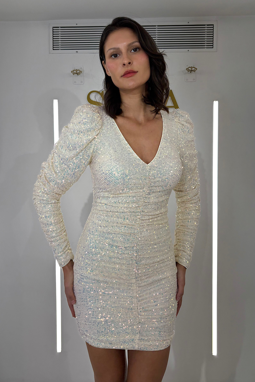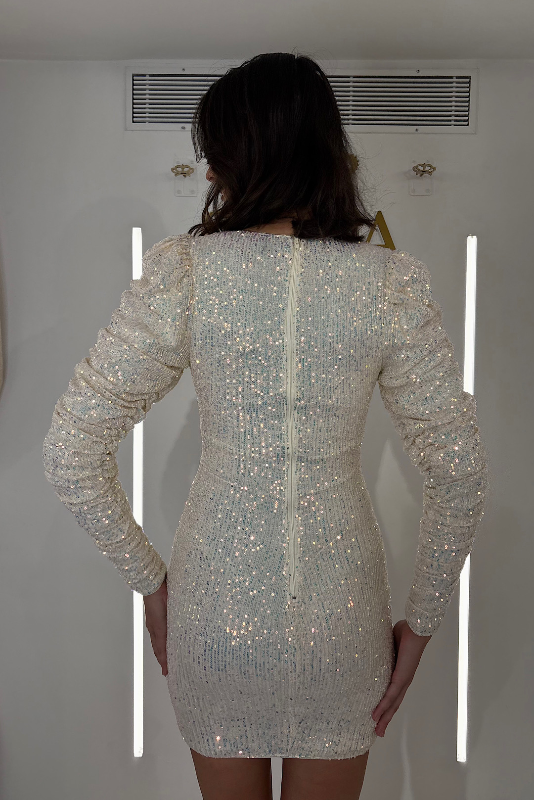 Ενα φόρεμα για να σε αντιπροσωπεύει στις βραδινές σου εξόδους με ιριδίζον παγιέτες παντού και εντυπωσιακά μανίκια.
