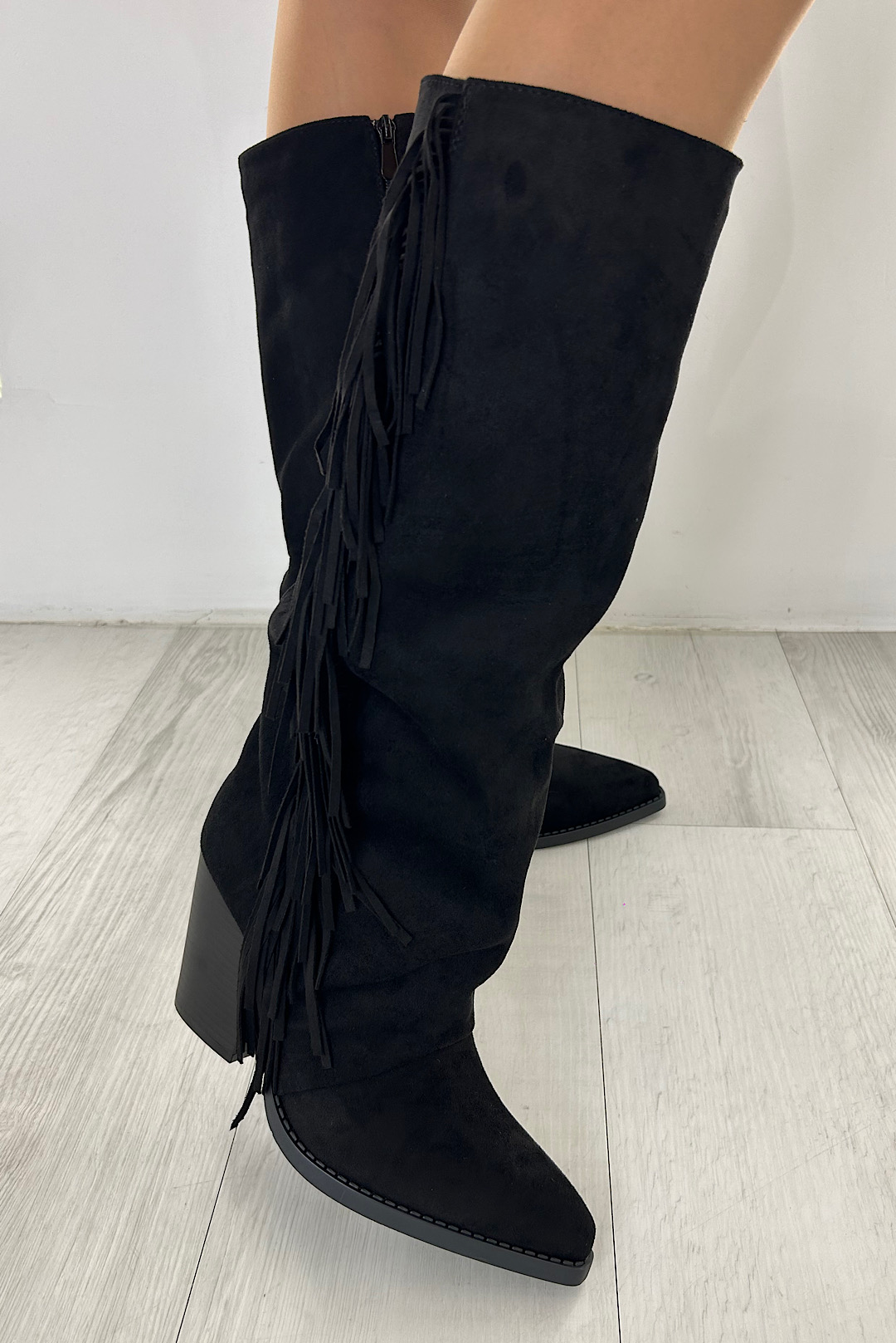 Μπότες σουέτ σε μπέζ και μαύρο χρώμα με κρόσια στην εξωτερική μεριά