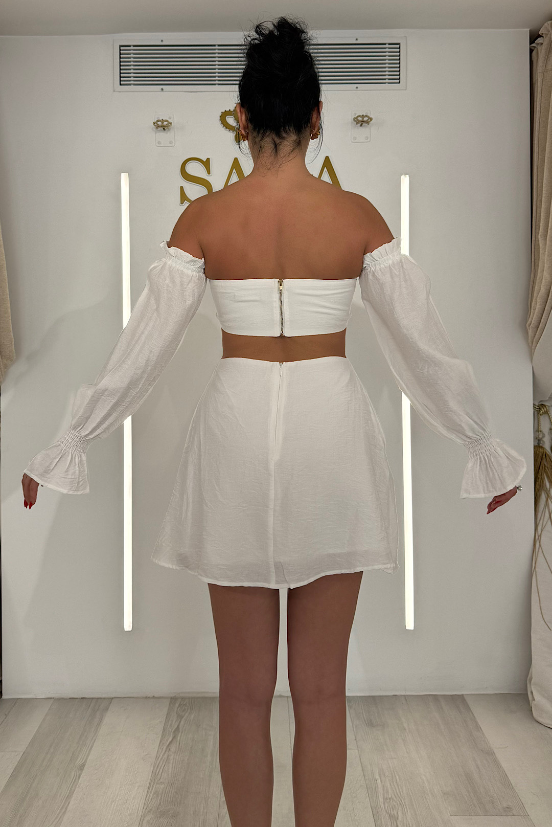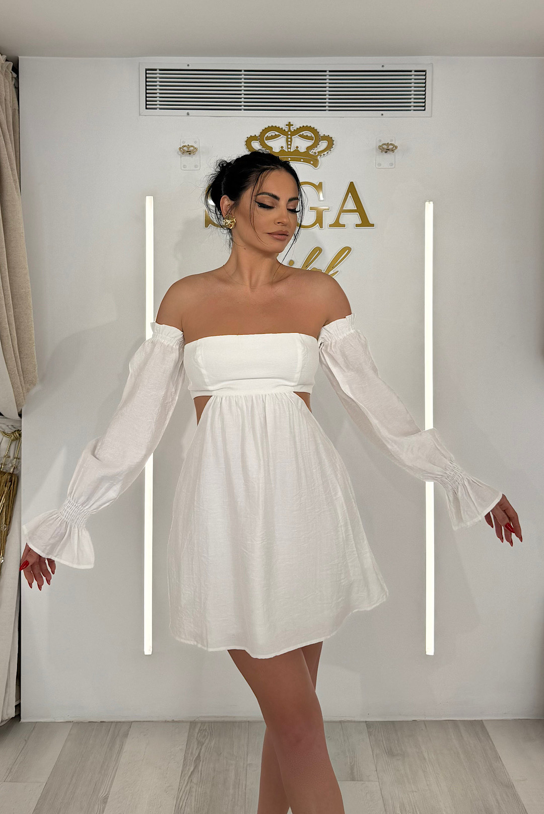 Κοντό στράπλες φόρεμα με άνοιγμα στην μέση και αέρινα μανίκια.