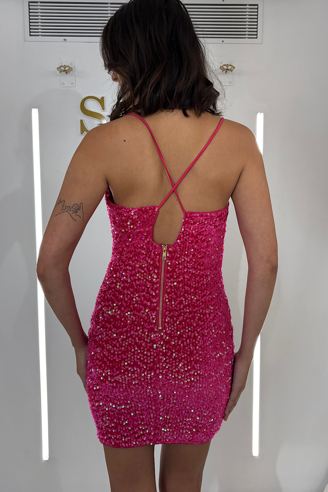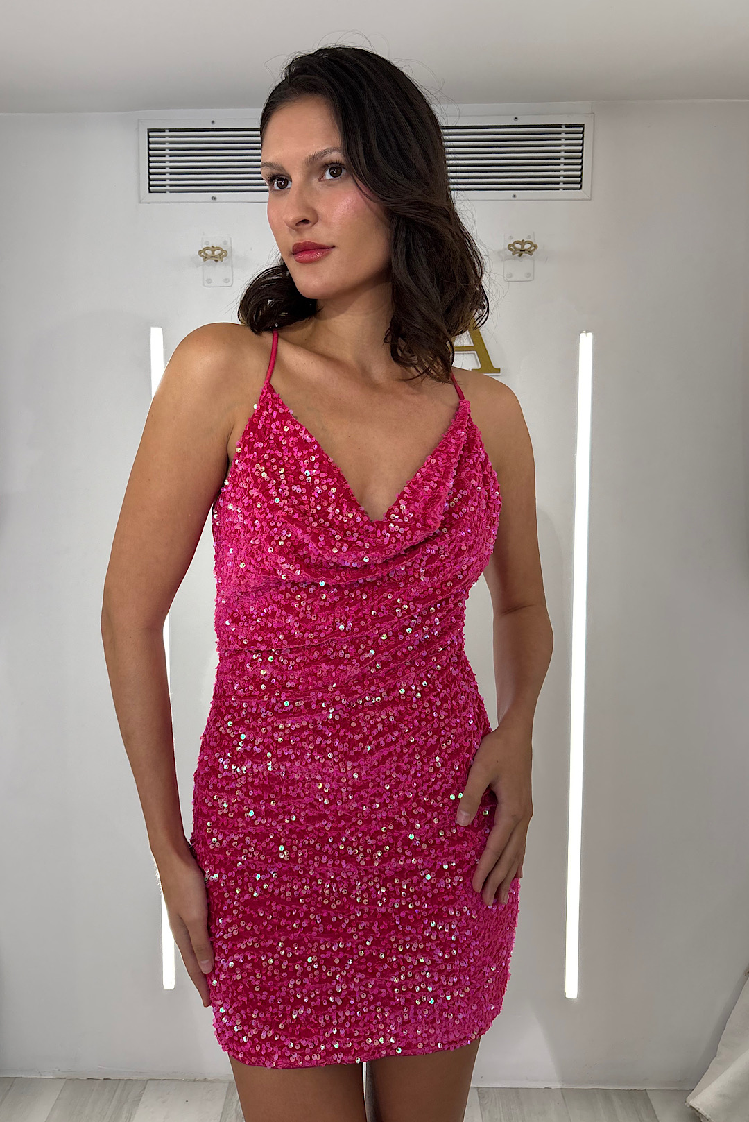 Ένα αστραφτερό mini φόρεμα σε ρόζ χρώμα με ιριδίζον παγιέτες και φερμουάρ στο πίσω μέρος