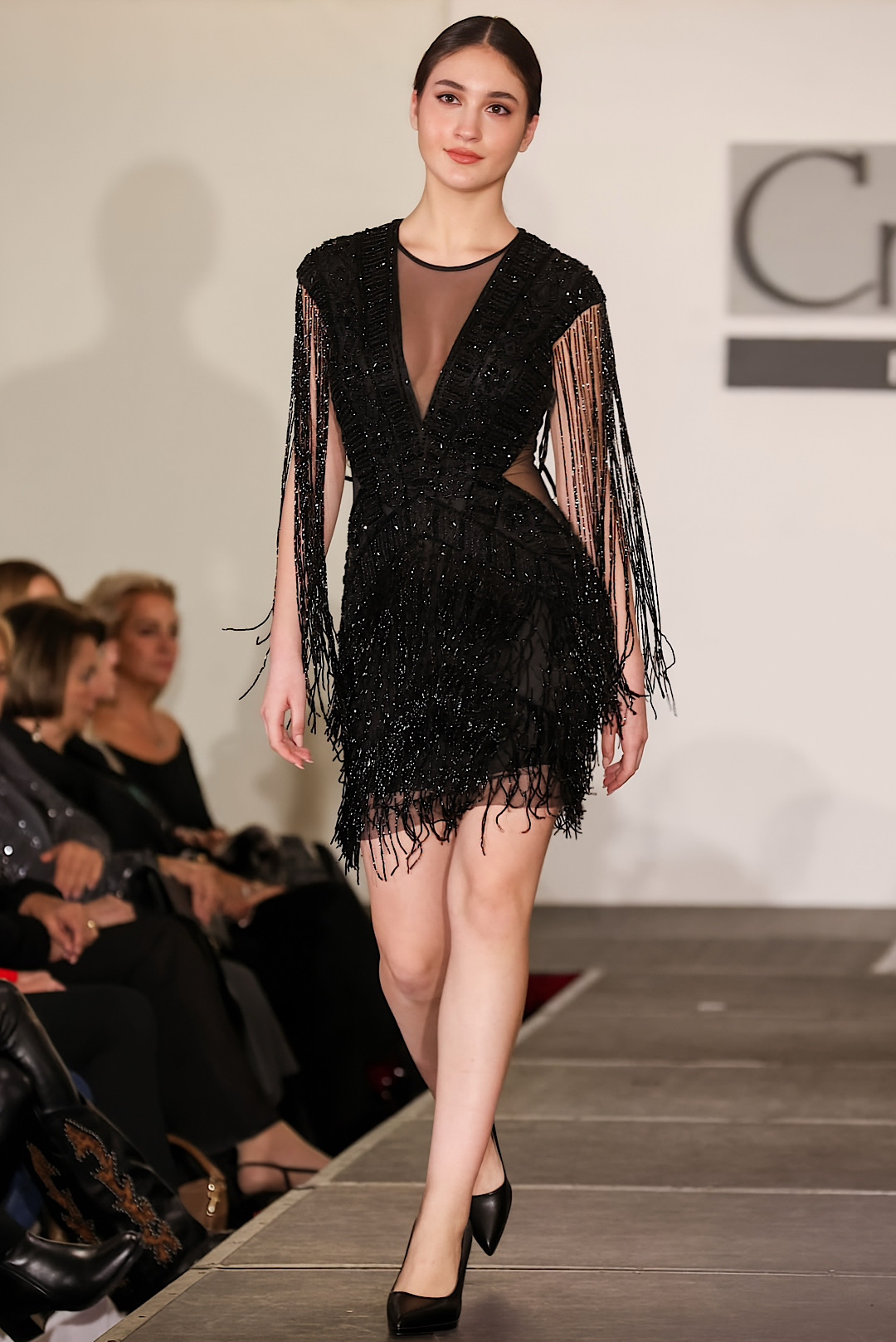 Μίνι χειροποίητο φόρεμα με κρόσσια από χάντρες στα μανίκια και δαντέλα στο μπούστο.